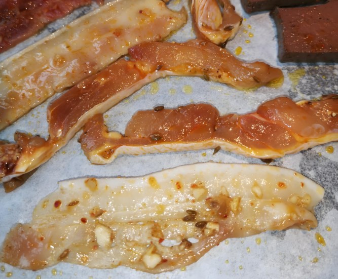 边城浪子湘派烤肉招牌五花肉每一片都切的很薄,一放上烤盘,肉就开始微微卷边~五花肉自带的油脂开始慢慢溢出,一定要把五花肉烤到表面微焦,这样才是好吃的!