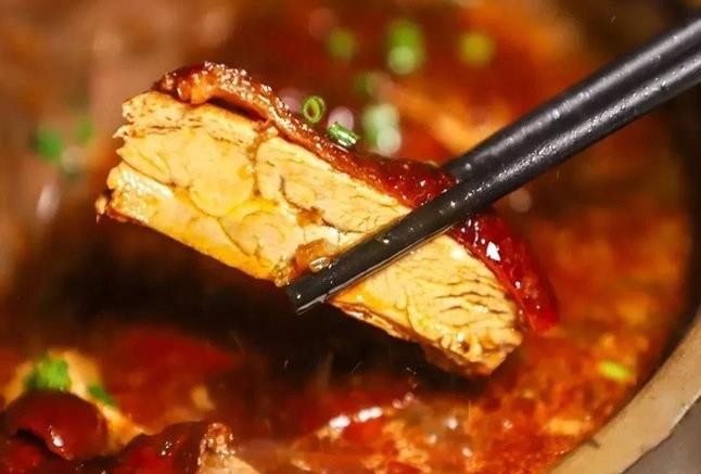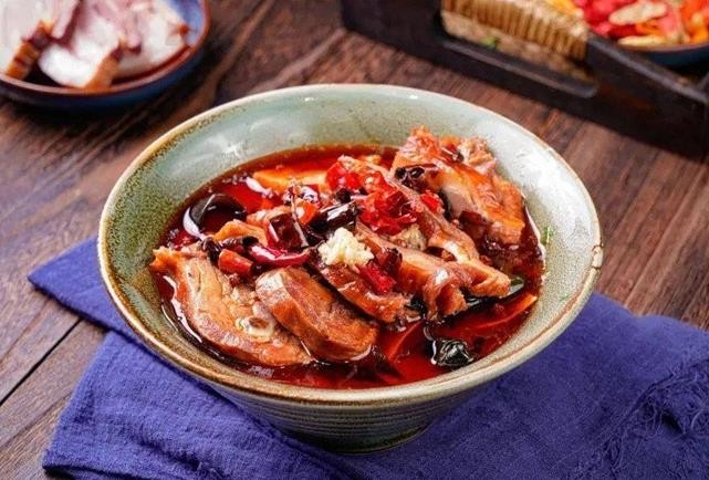 冒烤鸭是川渝地区的传统美食之一,是一道口感独特、风味鲜美的特色名菜。它结合了北京烤鸭的皮脆肉嫩和四川特有的冒菜吃法,将烤鸭切块后放到汤锅里烫一下,加上蔬菜,辅以秘制红油,最后撒上花椒、辣椒、芝麻、葱花,经过热油爆香,就是一钵热气腾腾,荤素搭配,鲜香四溢的川渝特色冒烤鸭。其中的红油辣椒、花椒,有着祛湿气、排热毒的功效。川、湘地区雨水多,气候潮湿,人体容易吸收湿气,当地人们之所以爱吃辣,就是这个原因。