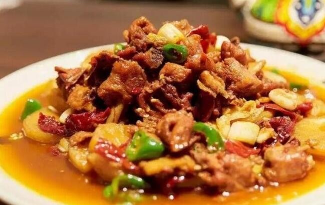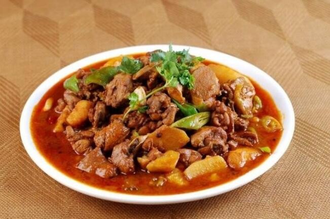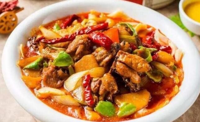 大盘鸡早起源于新疆,很快就风靡大江南北。如今以河南人口味为基础潜心研制的火狼大盘鸡更是别具特色,鸡肉鲜嫩香辣,土豆软糯甜润,面条更是爽滑筋斗。