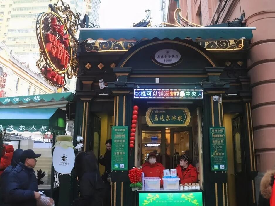在哈尔滨,在中央大街,马迭尔宾馆旁边那个卖冰棍的小窗口,绝对是一道风景,无论冬夏,无论雨雪,甚至零下20多度,游客站在充满欧陆风情的中央大街上,吃一根马迭尔冰棍才真正感觉到过哈尔滨,马迭尔冰棍也越来越成为这座“东方小巴黎”的城市名片。而今年春节黄金周,马迭尔冰棍更是爆“火”,仅哈尔滨中央大街店就销售23万支,这些冰棍连在一起有6公里长,相当于5条中央大街的长度。