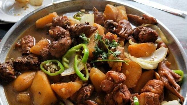 新疆大盘鸡是新疆知青创造的地区名菜,大约起源于80年代后期,主要用料为鸡块和土豆块,配皮带面烹饪而成。菜品色彩鲜艳,有爽滑麻辣的鸡肉和软糯甜润的土豆,辣中有香,粗中带细,而且经济实惠,亲朋聚会食用尚佳。